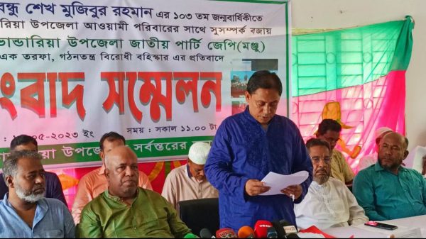 ভান্ডারিয়ায় জেপি নেতাদের গঠনতন্ত্র বহির্ভূত বহিষ্কারের প্রতিবাদে সংবাদ সম্মেলন।