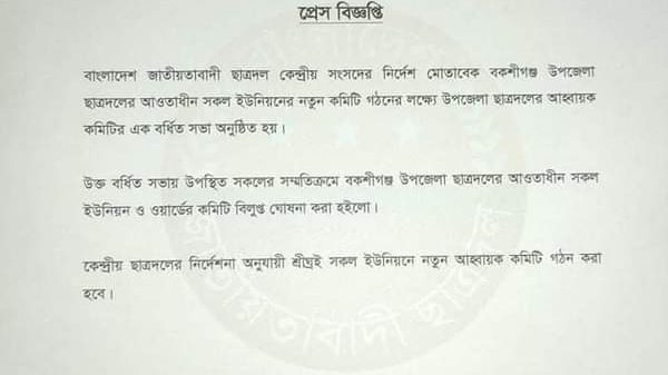 বকশীগঞ্জে ছাত্রদলের ইউনিয়ন ও ওয়ার্ড ইউনিটের সকল কমিটি বিলুপ্ত ঘোষণা।