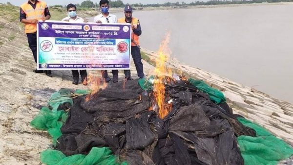 আনোয়ারায় পুড়ানো হলো ১৩ হাজার মিটার অবৈধ জাল ।