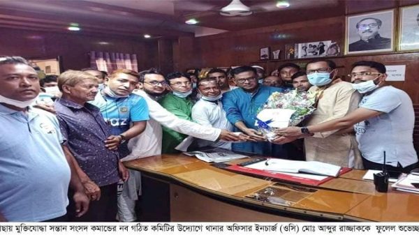 ঝিকরগাছায় মুক্তিযোদ্ধা সন্তান সংসদ কমান্ডের নব গঠিত কমিটির উদ্যোগে ওসিকে ফুলেল শুভেচ্ছা।