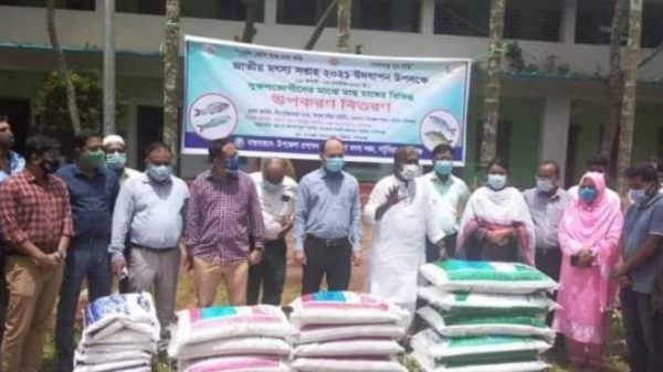 সাটুরিয়ায় মৎস্য খাদ্য ও চুন বিতরণ।