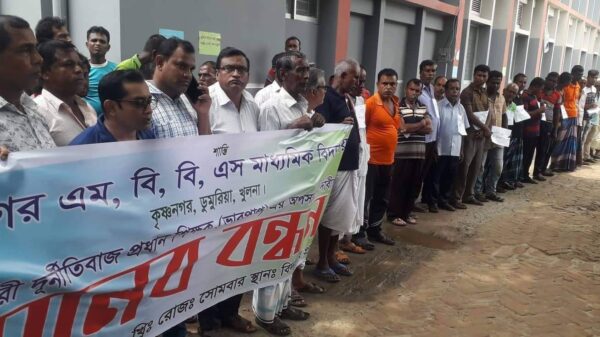 ডুমুরিয়ায় ভারপ্রাপ্ত প্রধান শিক্ষক’র দুর্নীতির বিরুদ্ধে মানববন্ধন।
